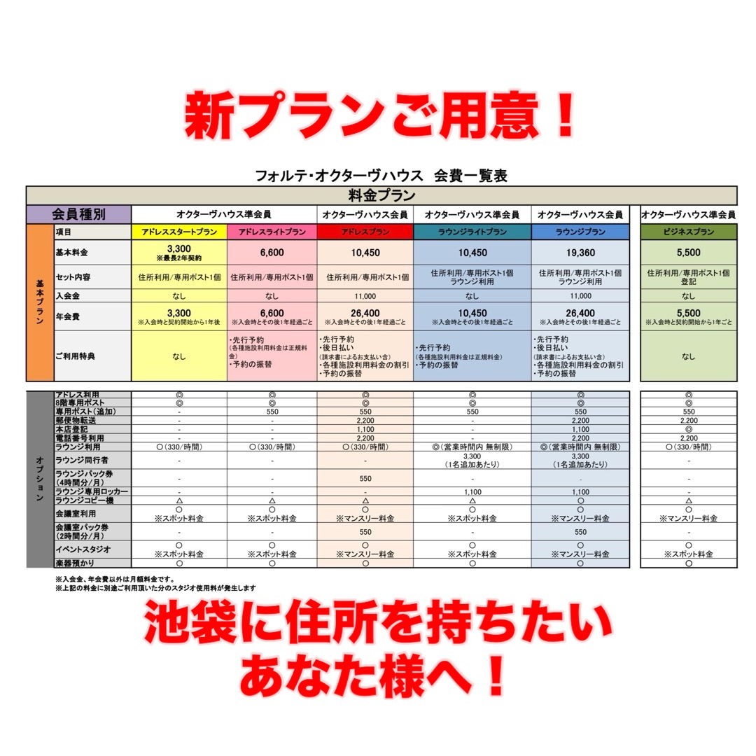 住所利用としてのみ活用するアドレスプラン、個人の事務所代わりとしてラウンジプラン、2つの会員制度がございます。また、会員登録されていない方でもスタジオ、会議室、ラウンジなどの一時利用や楽器、お荷物のお預かりサービスもご利用いただけます。